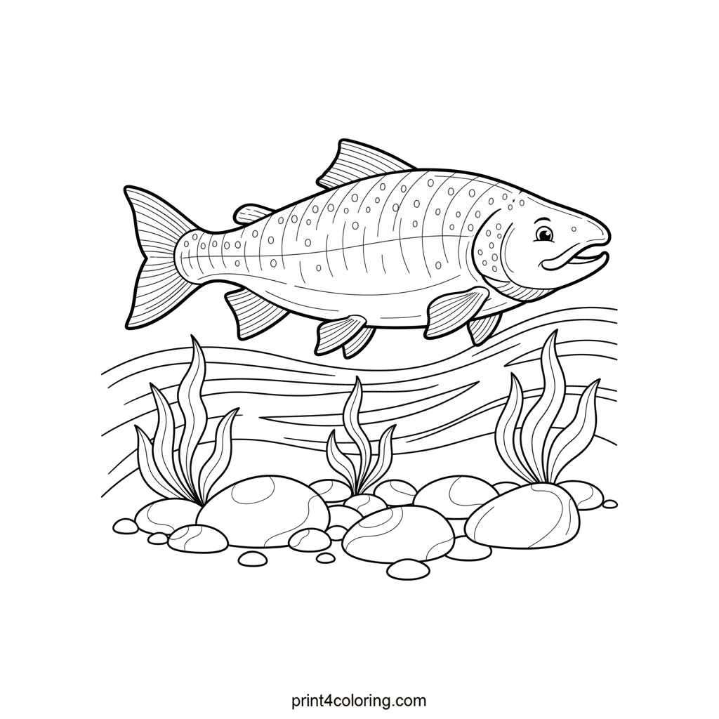 Dive into the tranquil world of a friendly river salmon! This detailed scene captures a magnificent adult salmon with textured scales, gently gliding through crystal-clear water. Smooth river stones and delicate aquatic plants create a peaceful underwater landscape, inviting you to add vibrant colors to its graceful journey.