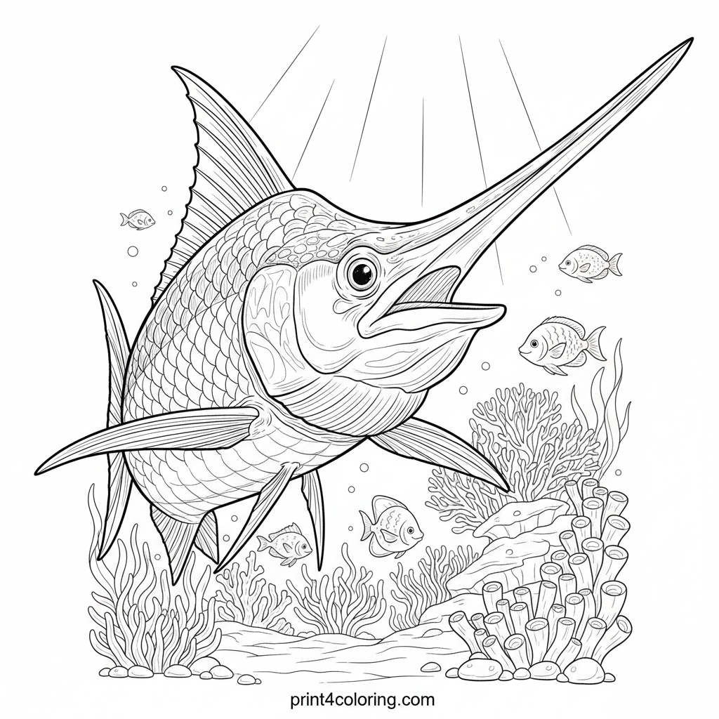 Dive into an expert coloring adventure! A magnificent swordfish, detailed with scales and powerful fins, gracefully glides through a stunning deep-sea garden. Explore intricate corals, swaying anemones, and playful schools of fish, all bathed in shimmering sunlight. This vibrant underwater world awaits your creative colors!