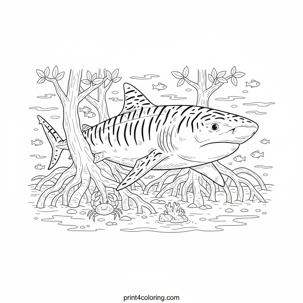 Mangrove Mystery: The Camouflaged Tiger Shark Coloring Page