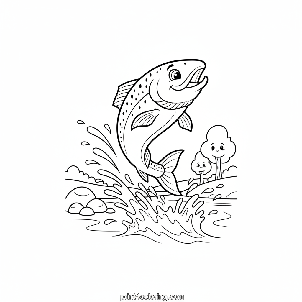 Witness the incredible strength of nature with this dynamic coloring page! A powerful salmon bursts mid-air from the river, surrounded by magnificent splashes. Imagine its journey and determination as you bring this exciting scene to life with your vibrant colors. An inspiring aquatic adventure for all ages!