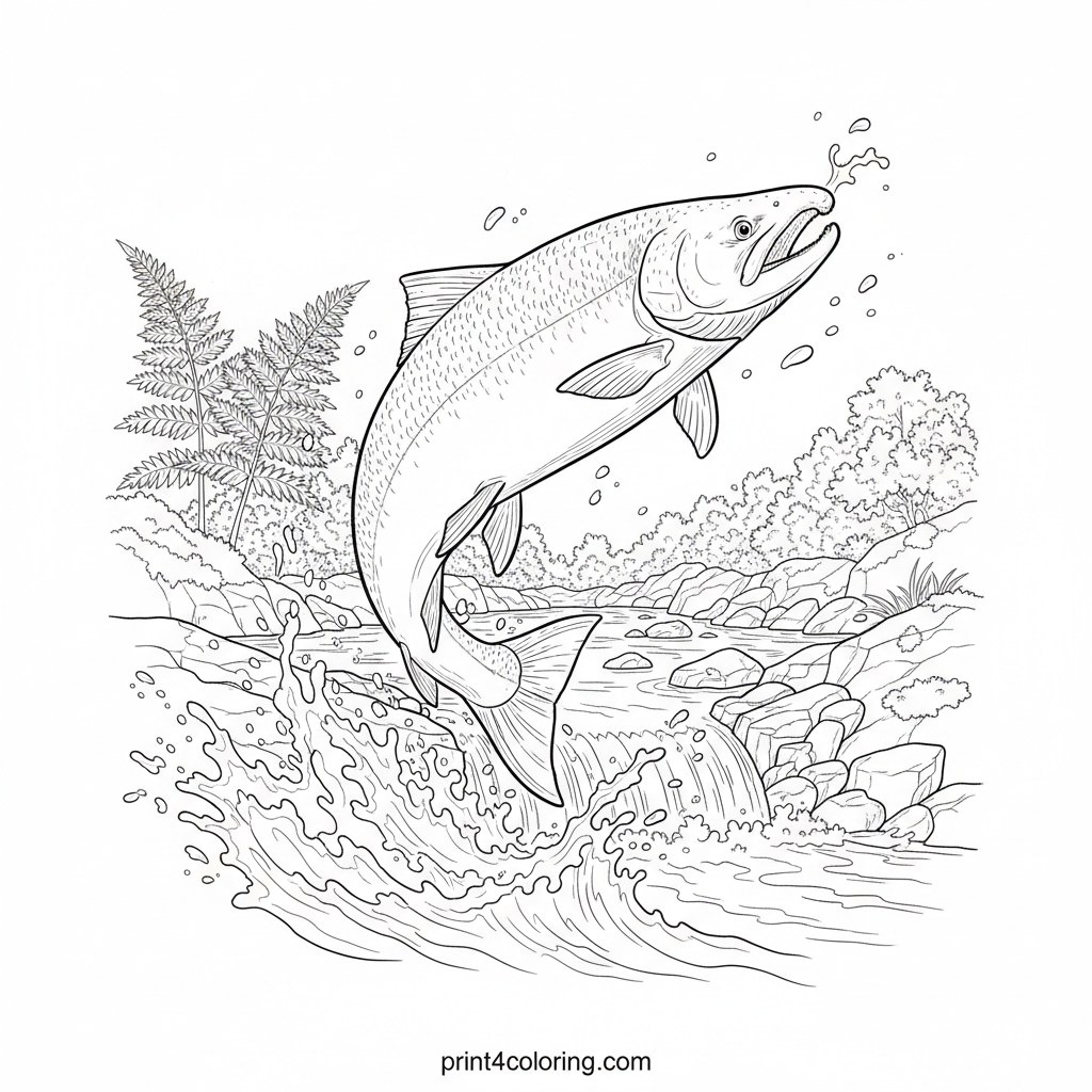 Witness the incredible strength of a salmon as it bravely leaps upstream! This detailed coloring page captures a powerful salmon mid-air, muscles flexed, soaring over a rocky cascade. Imagine the cool river water splashing as it makes its determined journey home. A beautiful scene of nature's perseverance awaits your colors!