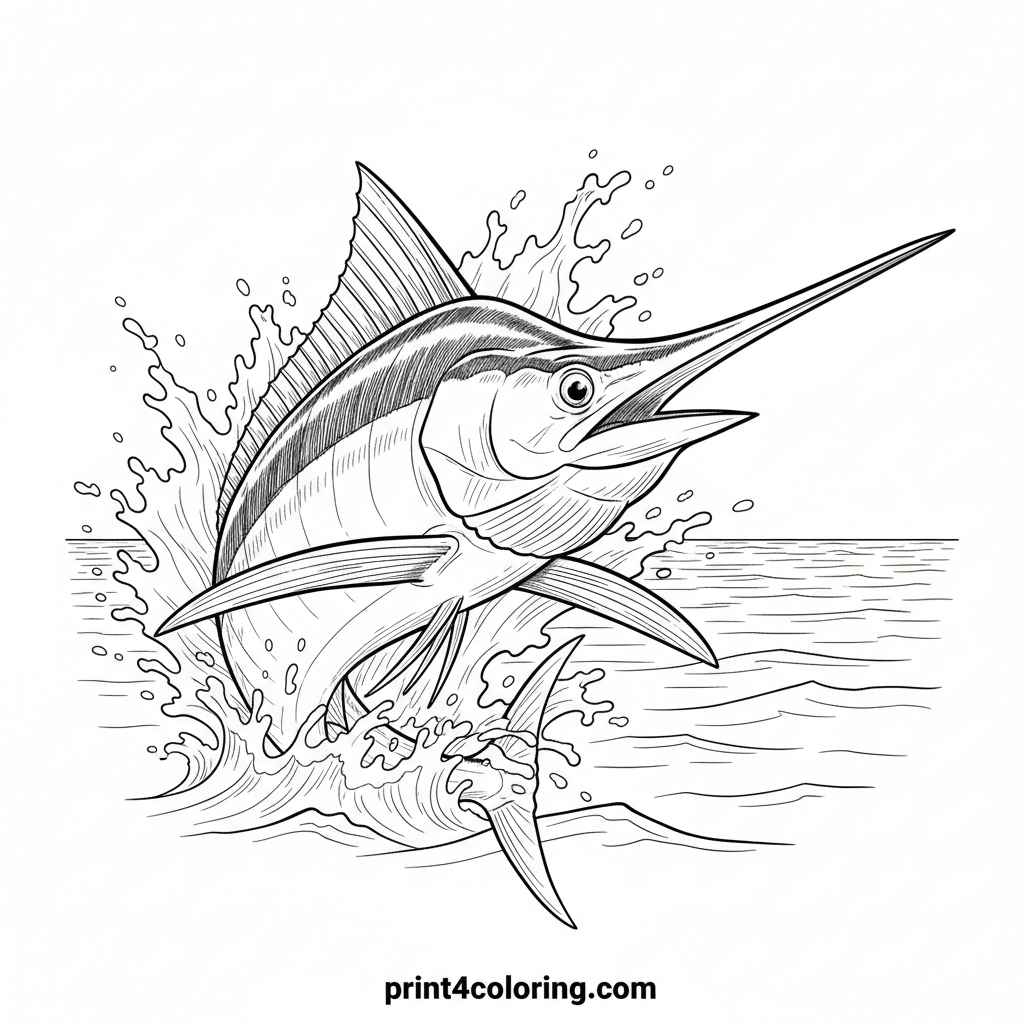 Dive into the thrilling world of the ocean with this expert coloring page! Witness a magnificent marlin in its most powerful moment, leaping high above the waves. Capture the dynamic splashes and the marlin's incredible strength as it arcs through the air. Use your colors to bring this majestic ocean hunter to life!
