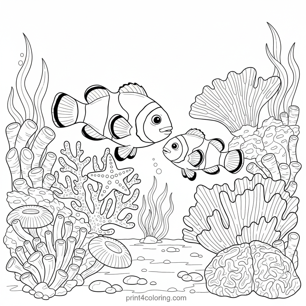 Dive into an underwater adventure with two cheerful clownfish! Watch as they gracefully explore their vibrant coral reef home, maybe peeking at a friendly starfish or weaving through colorful coral. This detailed scene invites you to bring the ocean's beauty to life with your favorite colors, capturing gentle movement and interaction.