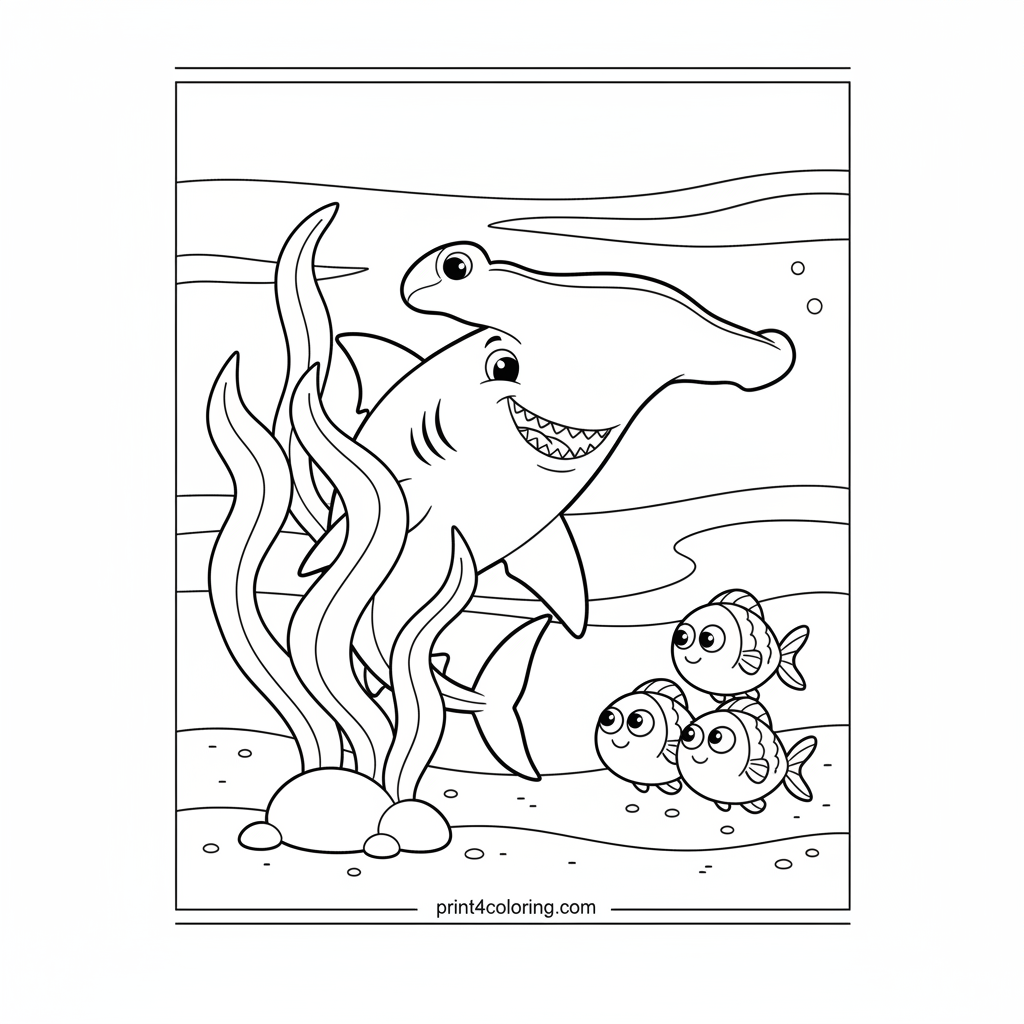 Dive into a delightful underwater game! A friendly hammerhead shark is having a blast playing hide-and-seek, peeking from behind a swishy seaweed plant. A tiny school of smiling fish are just about to spot him in this joyful ocean scene. Get ready to add vibrant colors to their aquatic fun!
