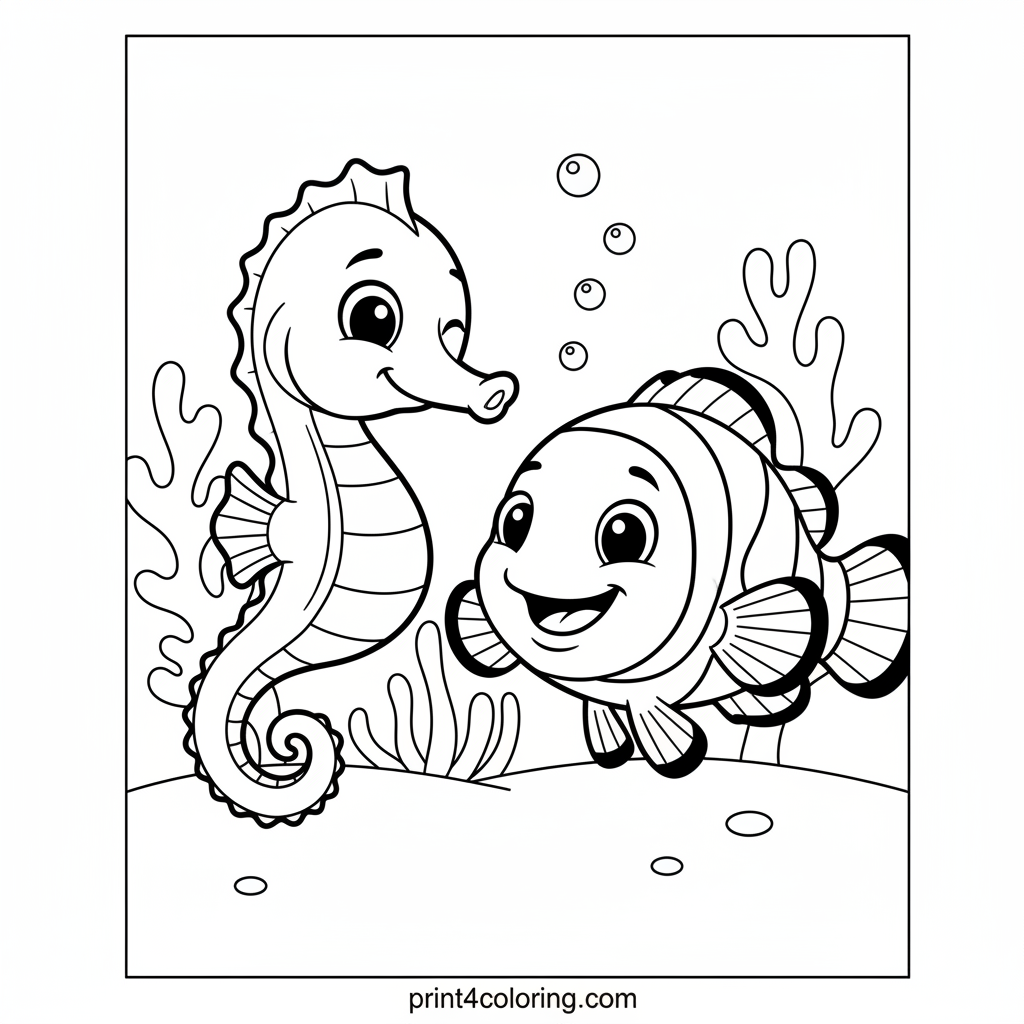 Dive into an underwater adventure! This coloring page features a graceful seahorse joyfully racing alongside a friendly, smiling clownfish through a vibrant, simple coral reef. Imagine the clear blue water and the colorful corals as you bring this exciting ocean scene to life with your favorite crayons and markers. Get ready for some fin-tastic fun!
