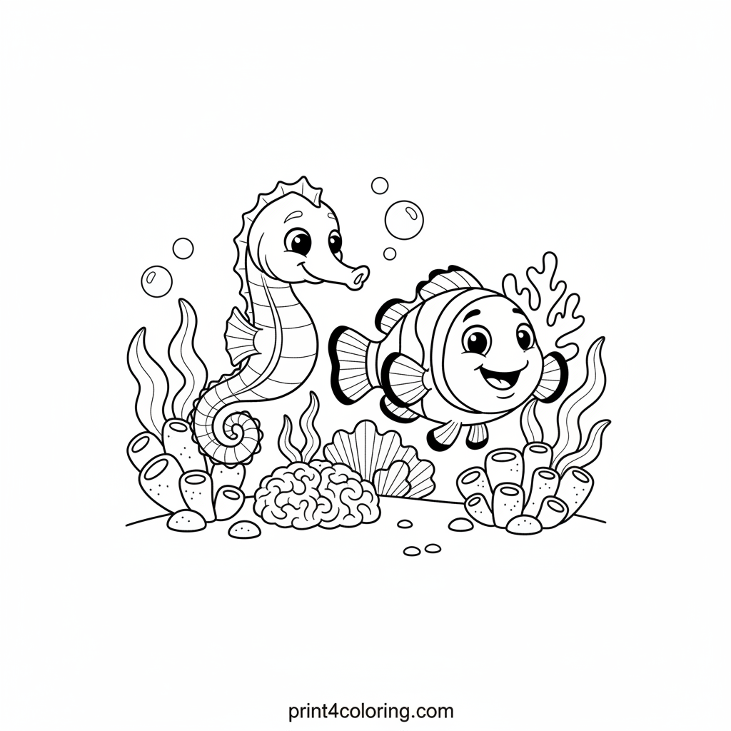 #seahorse#clownfish#reef#ocean#underwater#fish#marine-life#coral#friendship#coloring-page#printable