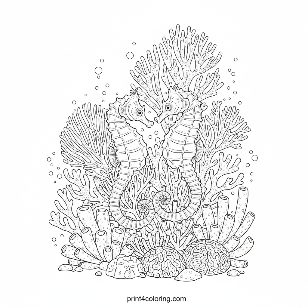 Explore a mesmerizing underwater world! Two graceful adult seahorses, tails gently intertwined, float amidst a vibrant garden of fan corals and sponges. Delicate plankton adds fine detail, and intricate patterns on the seahorses await your expert touch. This challenging page is perfect for seasoned colorists!
