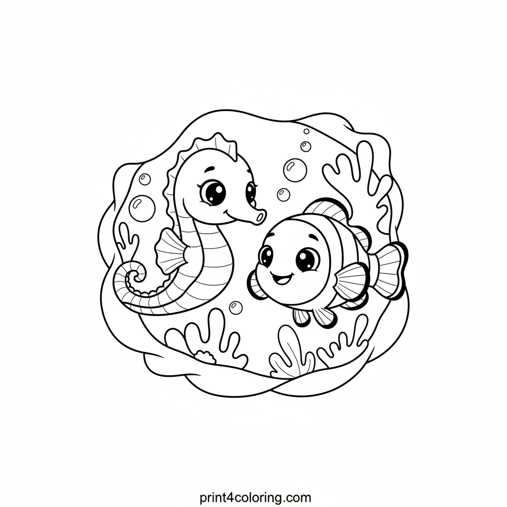 Dive into an underwater adventure! A graceful seahorse and its cheerful clownfish friend are having a friendly race through a vibrant, simple coral reef. This cozy scene is perfect for young artists to bring the ocean to life with their favorite colors, creating a beautiful underwater masterpiece. Get ready for fun!