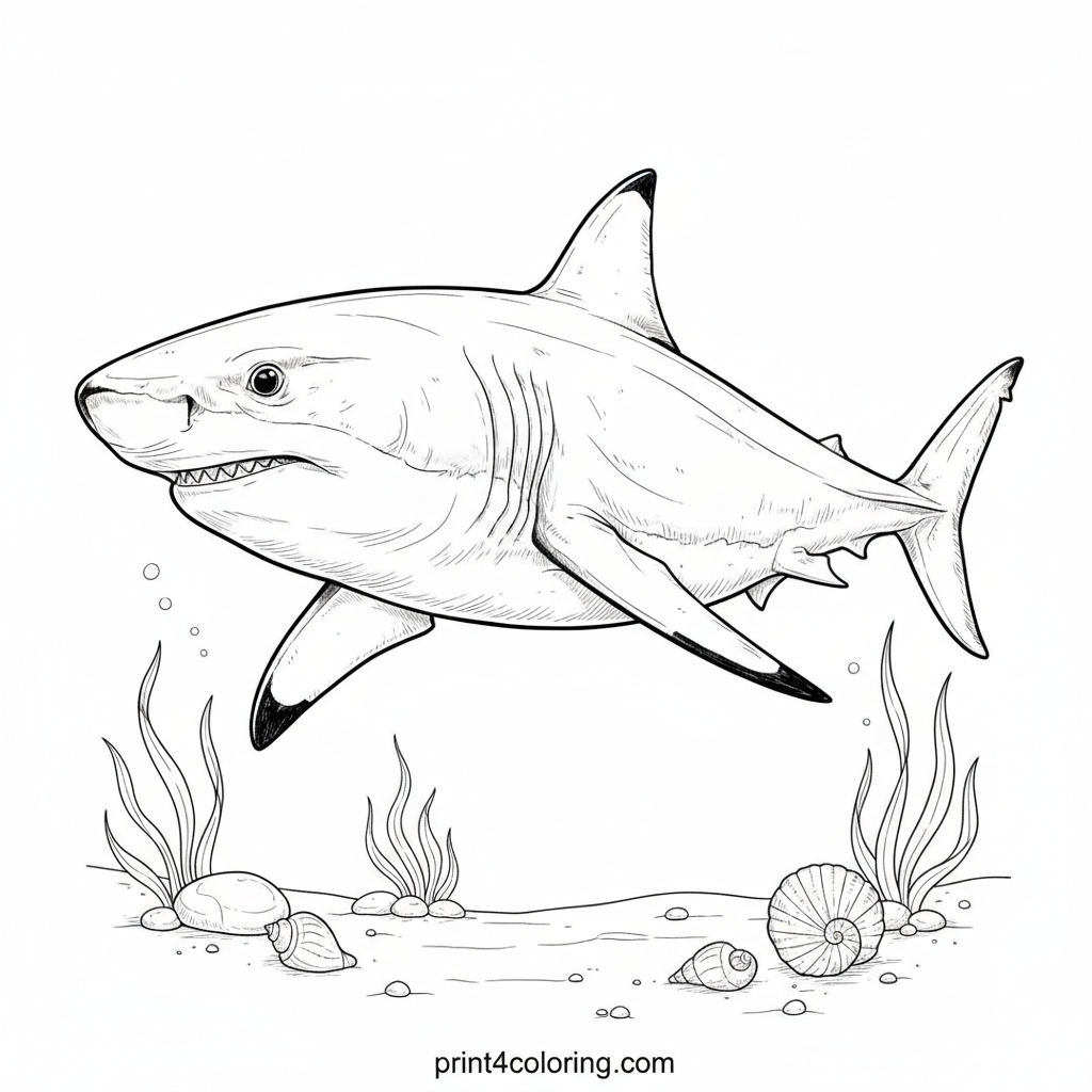Explore a tranquil underwater world! This expert coloring page features a magnificent great white shark resting peacefully on a detailed sandy seabed. Bring to life intricate seashells, smooth pebbles, and gently swaying sea grass, creating a serene ocean scene with your creative colors.