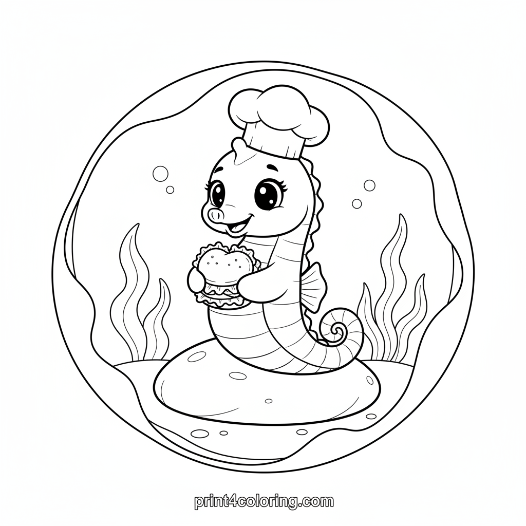 Join our cheerful seahorse, wearing a tiny chef's hat, for a delightful snack time! Happily perched on a smooth rock, this cute ocean friend is enjoying a miniature seaweed sandwich. Dive into this charming underwater scene and bring it to life with your favorite colors. A cozy and fun adventure awaits!