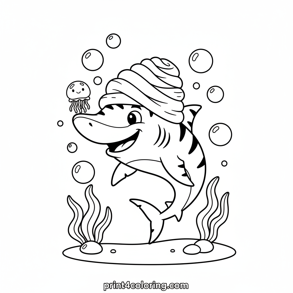 Dive into a silly underwater adventure with a cheerful tiger shark! This friendly fish is rocking a hilarious, oversized seaweed hat and balancing a tiny, smiling jellyfish on its nose, all while blowing happy bubbles. Get ready to add vibrant colors to this fin-tastic scene and bring the ocean to life!