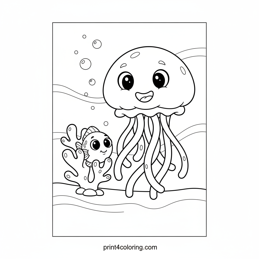 Dive into an enchanting underwater world! This coloring page features a cheerful, smiling jellyfish with big friendly eyes, gently drifting near vibrant coral. A tiny, curious fish peeks out, eager to join the fun. Bring this peaceful ocean scene to life with your favorite colors and create a magical ocean playdate!