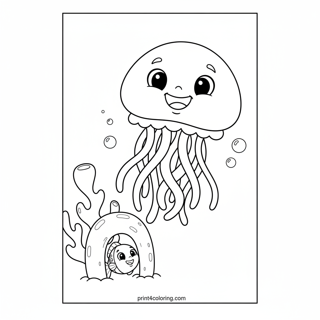Meet a happy, smiling jellyfish with big friendly eyes, gently floating near a vibrant coral reef. A tiny fish peeks out from behind the coral, playing a game of hide-and-seek. Use your imagination to color this delightful underwater scene and bring these ocean friends to life!
