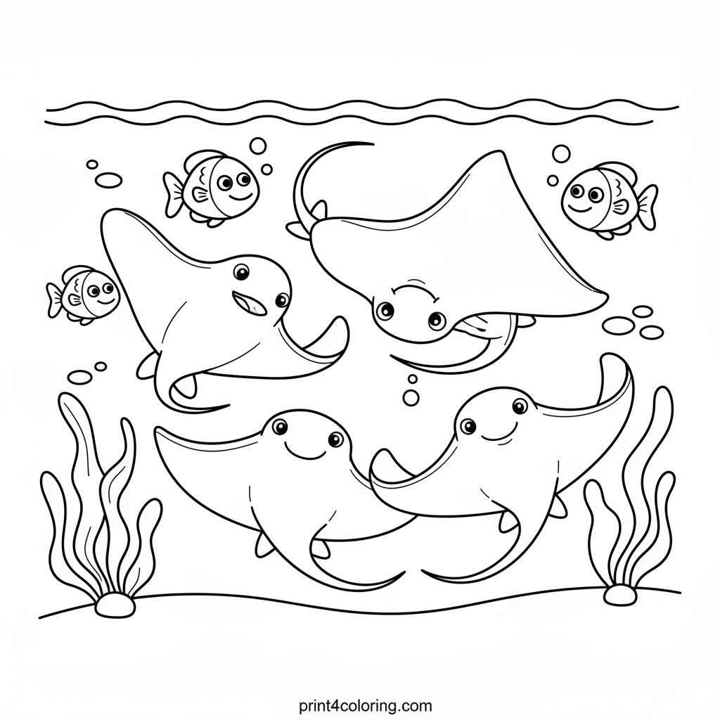 Dive into an enchanting underwater world where three magnificent stingrays perform a graceful ballet. Watch their flowing fins swirl and glide through the gentle ocean currents, surrounded by friendly fish and soft waves. A magical scene waiting for your colors!