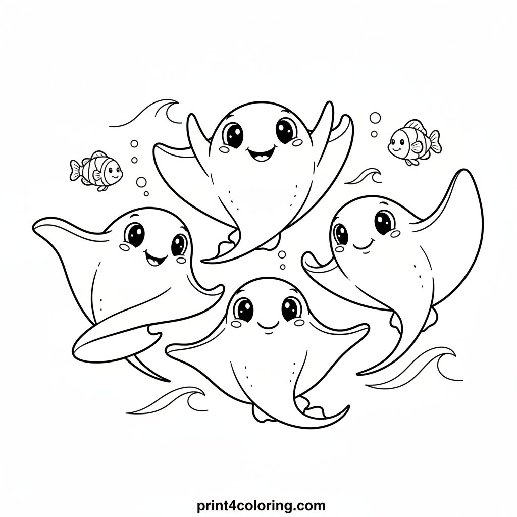 Dive into an enchanting underwater world where three adorable stingrays perform a graceful ballet! Watch their fins flow like elegant capes as they swirl through gentle waves, accompanied by friendly fish. This charming scene invites you to add vibrant colors to their cozy ocean dance.