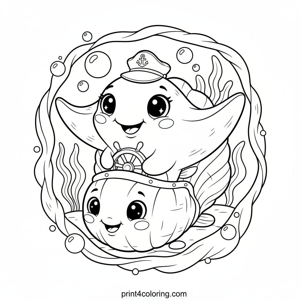 Dive into an enchanting underwater world with our cheerful stingray captain! Wearing a tiny hat, this friendly ray pilots a whimsical seashell submarine through a bubbly ocean. Imagine the vibrant colors you'll use to bring this cozy adventure to life, exploring coral reefs and meeting friendly fish along the way.