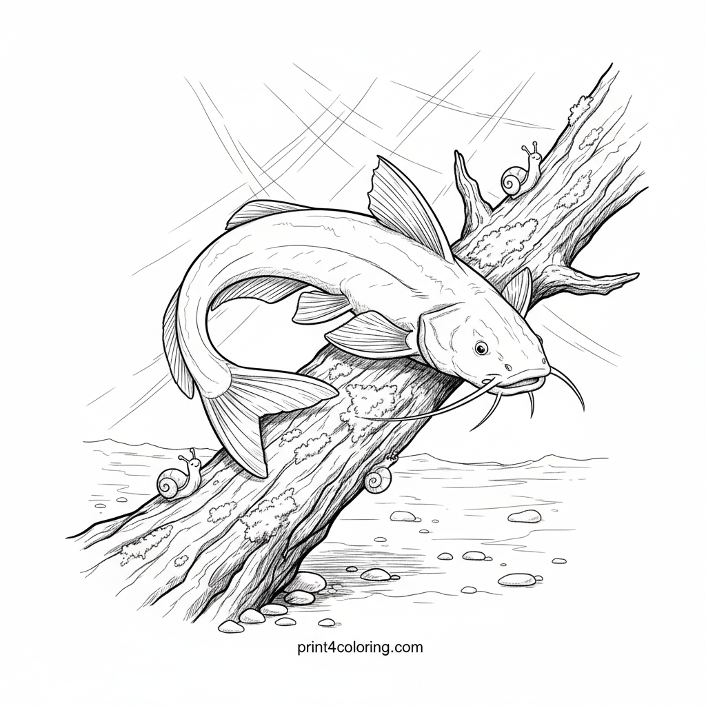 Dive into an underwater adventure! A magnificent catfish, with long whiskers, expertly explores a mossy, sunken tree branch. Watch for tiny water snails hitching a ride, while sparkling sunlight dances through the clear river. A perfect scene to bring to life with your favorite colors!