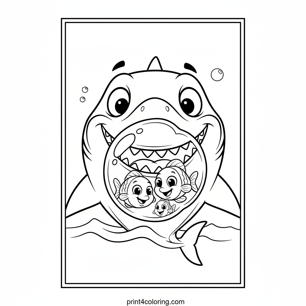 Dive into the ocean with a silly shark who's had a bubbly surprise! This close-up portrait shows a wide-eyed shark accidentally blowing a colossal, wobbly bubble. Look closely, tiny fish are peeking out from inside, adding to the fun. Get ready to add vibrant colors to this hilarious underwater scene!