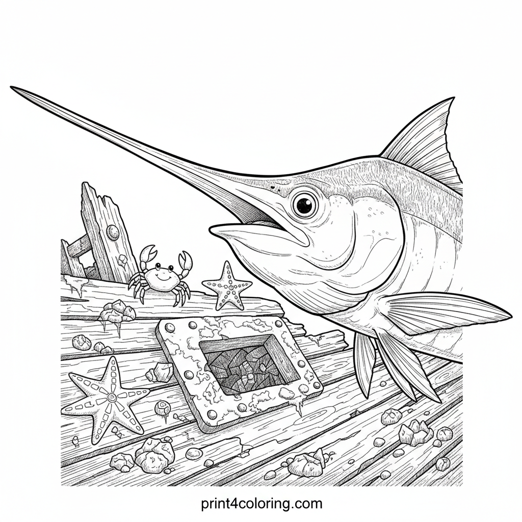 #swordfish#shipwreck#underwater#ocean#fish#marine-life#exploration#sea-creatures#detailed#coloring-page#printable