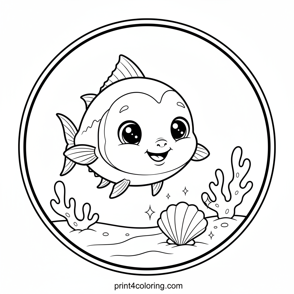Dive into an underwater adventure with Tiny Tuna! This adorable baby tuna, with big, curious eyes, is gracefully exploring a vibrant coral reef. What a discovery! He's found a dazzling, sparkling seashell resting on the soft, sandy ocean floor. Get ready to bring this cozy ocean scene to life with your favorite colors!
