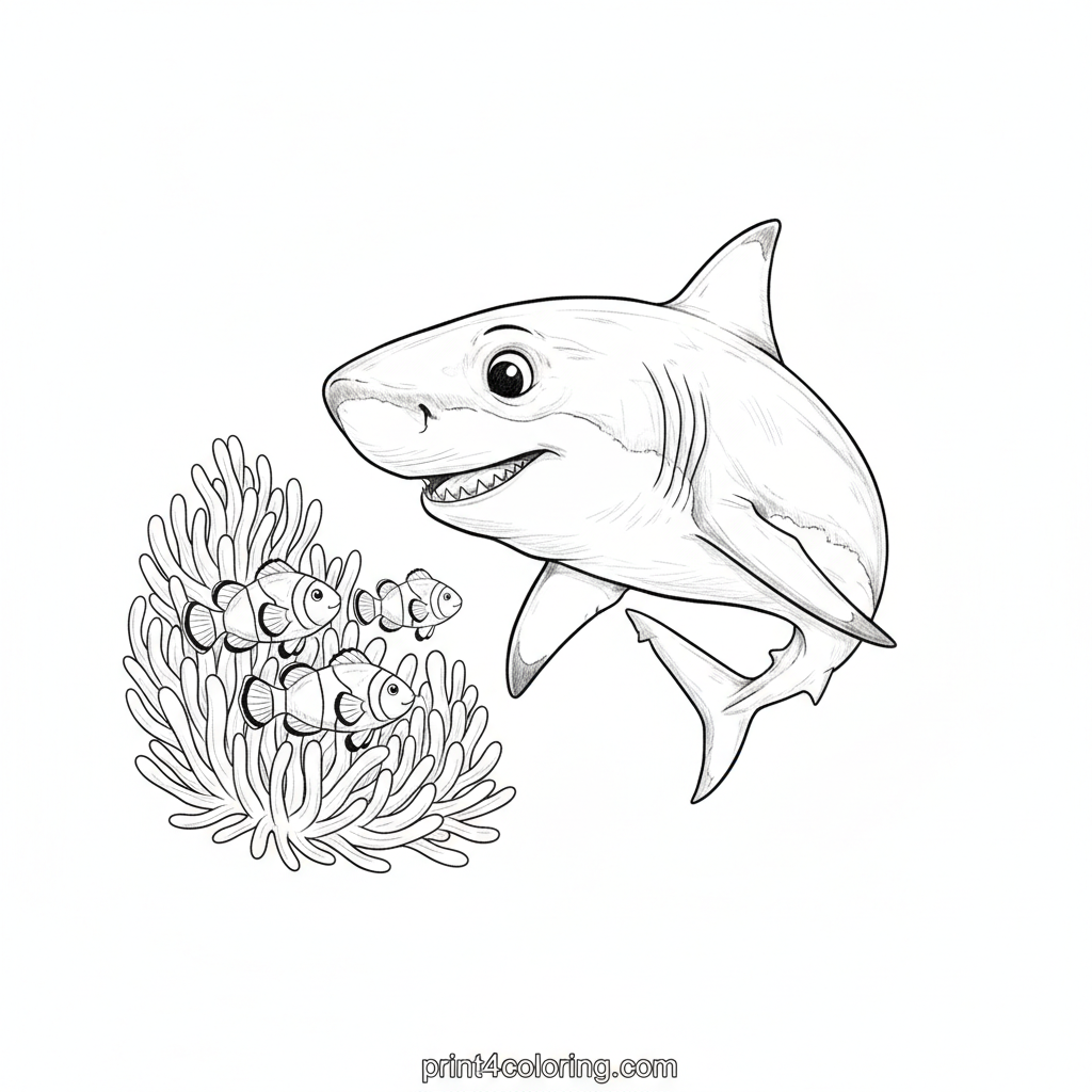 Dive into a captivating underwater world! A curious juvenile great white shark, with a gentle expression, carefully observes a vibrant cluster of sea anemones. Tiny, playful clownfish swim safely among the tentacles, creating a harmonious marine scene. Bring this detailed ocean adventure to life with your most vivid colors!