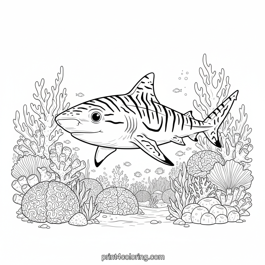 Young Tiger Shark's Coral Garden Adventure Coloring Page