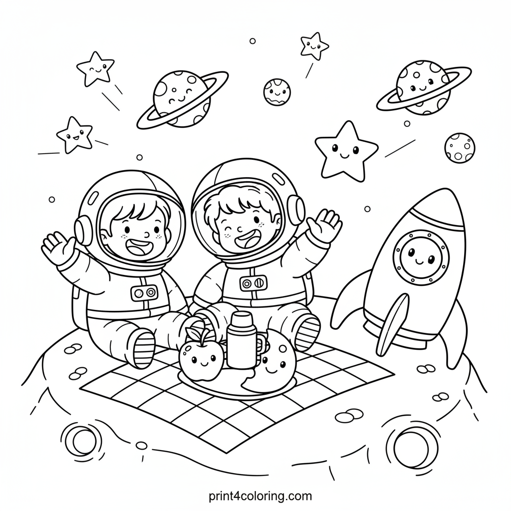 Join two cheerful child astronauts as they enjoy a yummy picnic on a tiny, round asteroid! Their friendly rocket is parked nearby, and they're waving hello just for you. Imagine the delicious snacks they're sharing in the vast, beautiful space. Get ready to add your favorite colors to this cosmic feast!