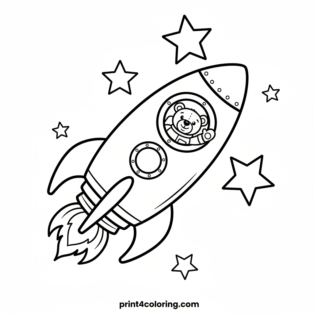 Blast off on an amazing adventure with a friendly, chubby rocket and its brave teddy bear astronaut! This cheerful duo is soaring through space, ready to explore new planets. Grab your crayons and add vibrant colors to their exciting journey among the stars. Watch Teddy wave hello from his cozy spaceship window!
