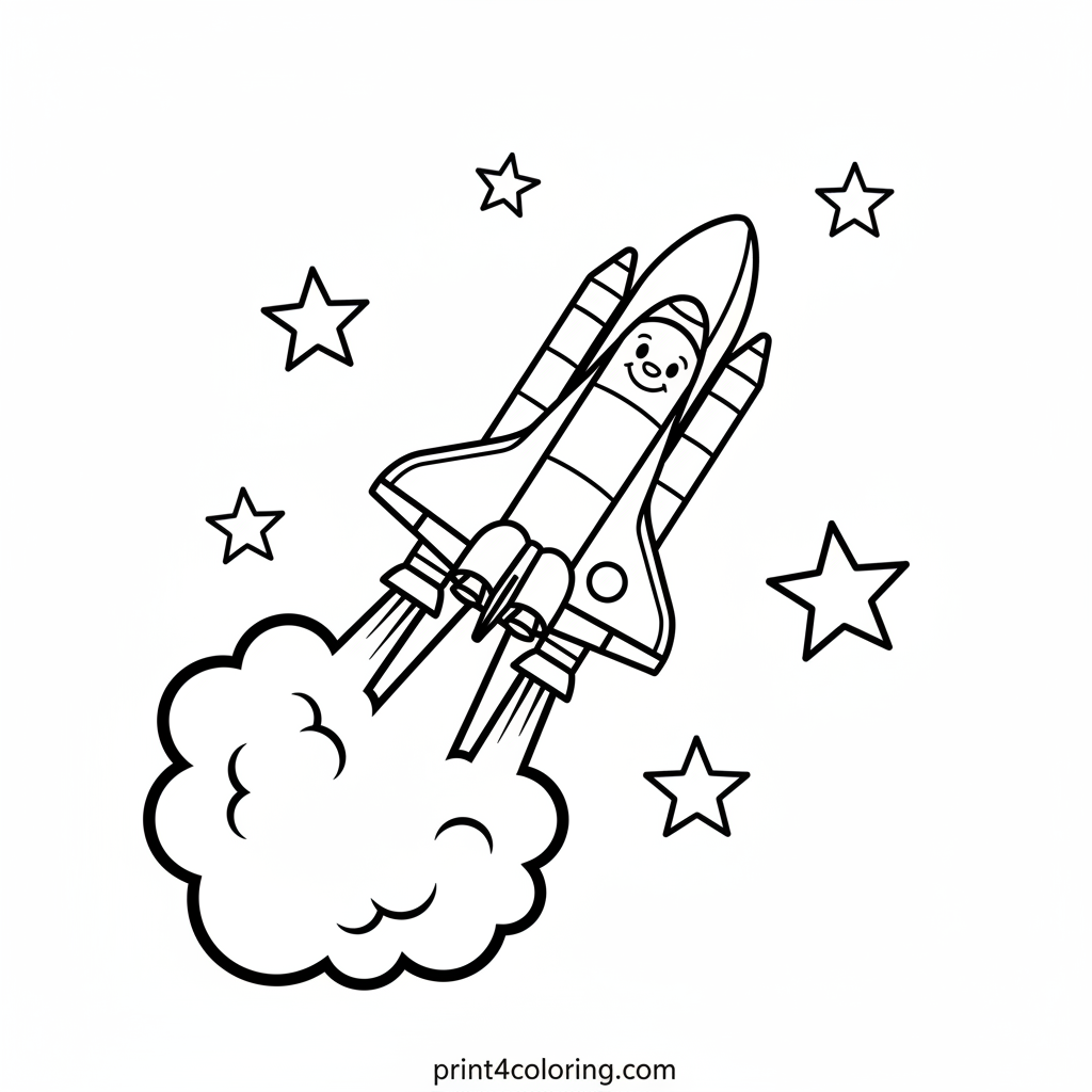 Get ready for an out-of-this-world coloring adventure! This page features a mighty space shuttle launching high into the sky, leaving a fun trail of puffy smoke and sparkling stars. Imagine the thrill of soaring towards the cosmos, ready to explore new frontiers. A perfect scene for aspiring astronauts!