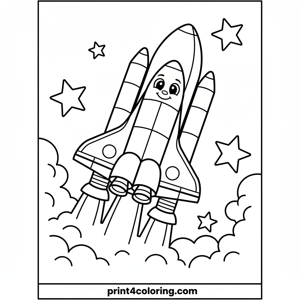 Get ready for an out-of-this-world adventure! This coloring page features a magnificent space shuttle rocketing into the sky. Watch its friendly, puffy smoke trail behind as it soars past sparkling stars. Imagine the thrill of exploring the cosmos and discovering new planets. Grab your crayons and add vibrant colors to this exciting journey!