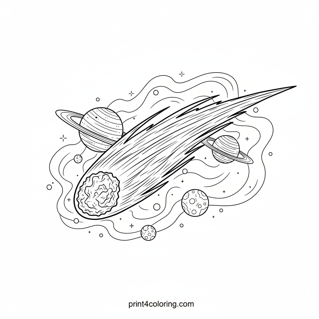 Embark on an epic coloring adventure with a magnificent comet blazing across the cosmos! This detailed scene features a luminous comet tail, intricate planets with unique textures, and distant, swirling nebulae. Discover the wonders of space as you bring this expert astronomical masterpiece to life.