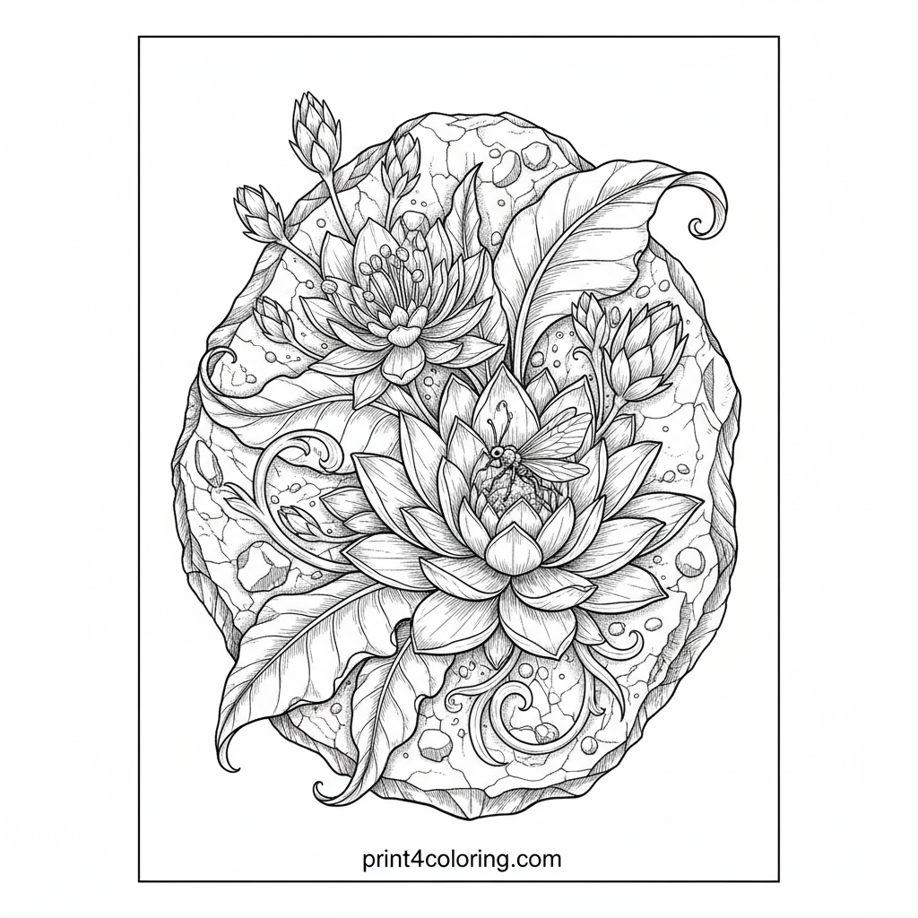 Journey to a wondrous celestial garden! This expert coloring page showcases a rugged asteroid adorned with scientifically plausible, yet imaginative, botanical life. Intricate leaves and delicate space flowers bloom, hosting a tiny, detailed space insect. A cosmic botanical adventure awaits your vibrant colors!