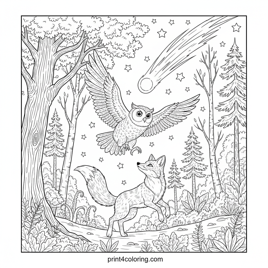 Join a wise owl and a curious fox in a beautifully detailed forest clearing, gazing up at a brilliant comet streaking across the star-filled night sky. This intricate scene captures the wonder of nature and the cosmos, inviting you to add vibrant colors to the trees, bushes, and forest floor under the celestial show.