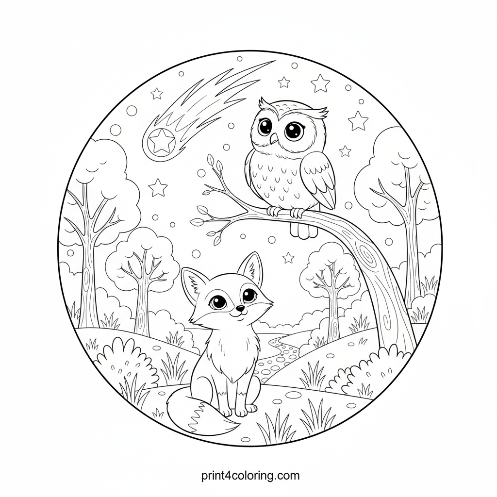 Step into a serene forest clearing where a wise owl and curious fox share a magical night! They peacefully observe a brilliant comet streaking across the star-filled sky. This intricate scene, with detailed trees and a friendly forest floor, captures the wonder of nature and a spectacular celestial event. A cozy night adventure!