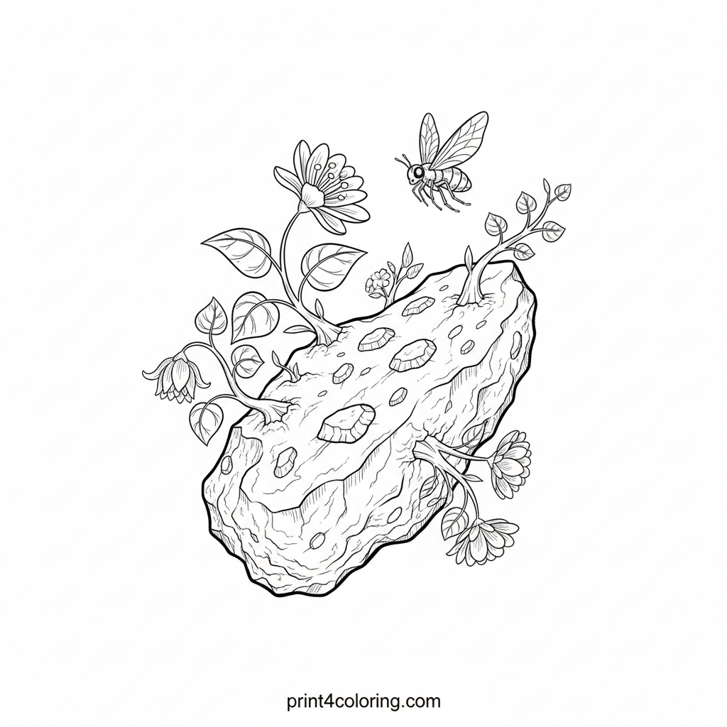 Discover a unique asteroid where extraordinary space plants thrive! This detailed scene showcases intricate flora blooming from a craggy surface, with delicate leaves and beautiful flowers. A tiny, curious space insect perches on a bloom, inviting you to add vibrant colors to this cosmic botanical marvel.