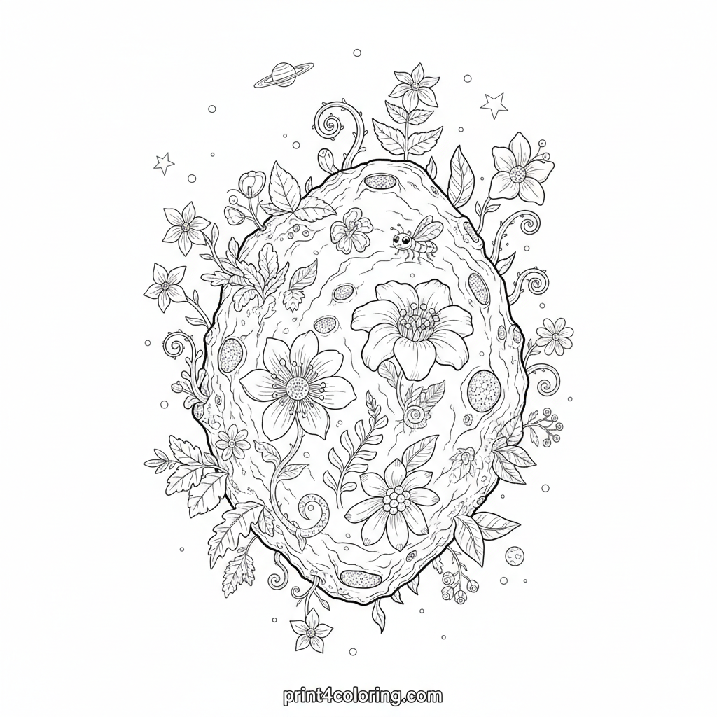 Journey to a fantastical asteroid garden where unique space plants thrive! Discover intricate leaves, delicate flowers, and a tiny space insect perched gracefully. This detailed scene invites you to imagine a universe teeming with life, even on a rocky celestial body. Use vibrant colors to bring this cosmic botanical wonderland to life!