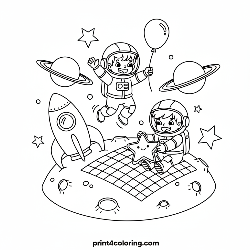Blast off to fun with this adorable coloring page! Two brave child astronauts have landed their friendly rocket on a cozy asteroid for a special space picnic. They're enjoying yummy treats under the stars and waving hello just for you! Get ready to add vibrant colors to their out-of-this-world adventure.
