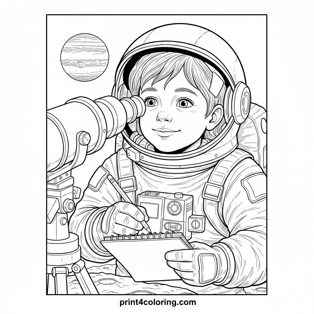 Explore the cosmos with a young astronaut observing majestic Jupiter from a distant moon. Color Jupiter's swirling gas patterns, the iconic Great Red Spot, and the astronaut's high-tech gear as they sketch the universe's beauty. A stellar adventure awaits your crayons!