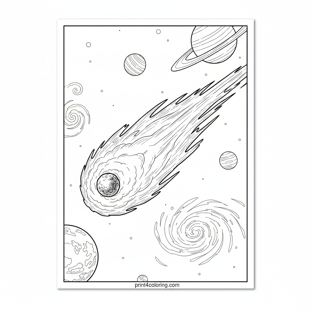 Embark on an epic cosmic adventure! This detailed coloring page features a magnificent comet, its luminous tail streaking across the starry abyss. Discover beautifully textured planets and soft, distant nebulae in this realistic astronomical scene. Perfect for aspiring astronomers and artists to bring the wonders of space to life with vibrant colors.