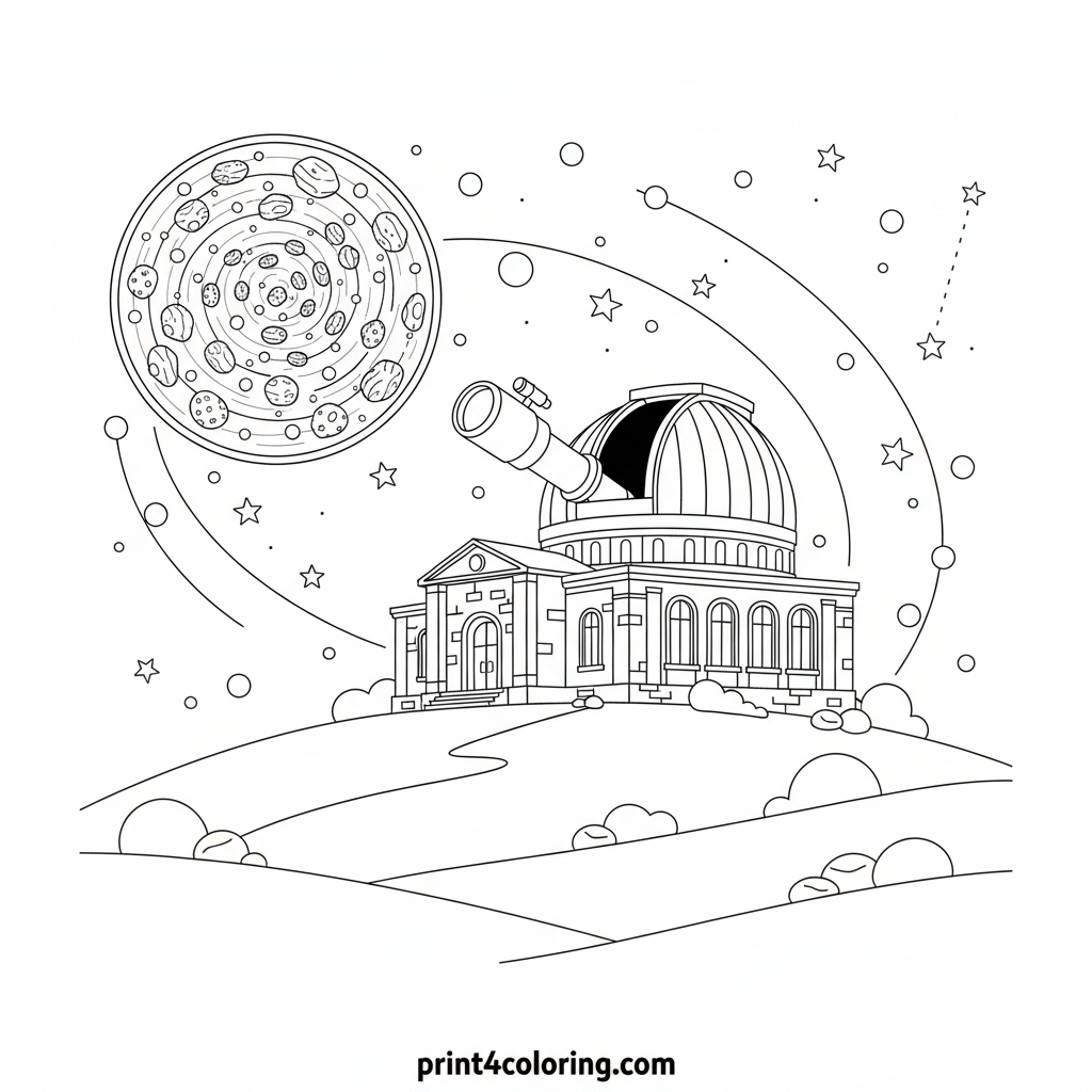 Embark on a cosmic journey! Color a magnificent observatory with a powerful telescope, set on a hill under a brilliant starry night. Peer through the lens to discover a distant, intricate asteroid belt, a fascinating highway of rocks. Bring this celestial wonder to life!
