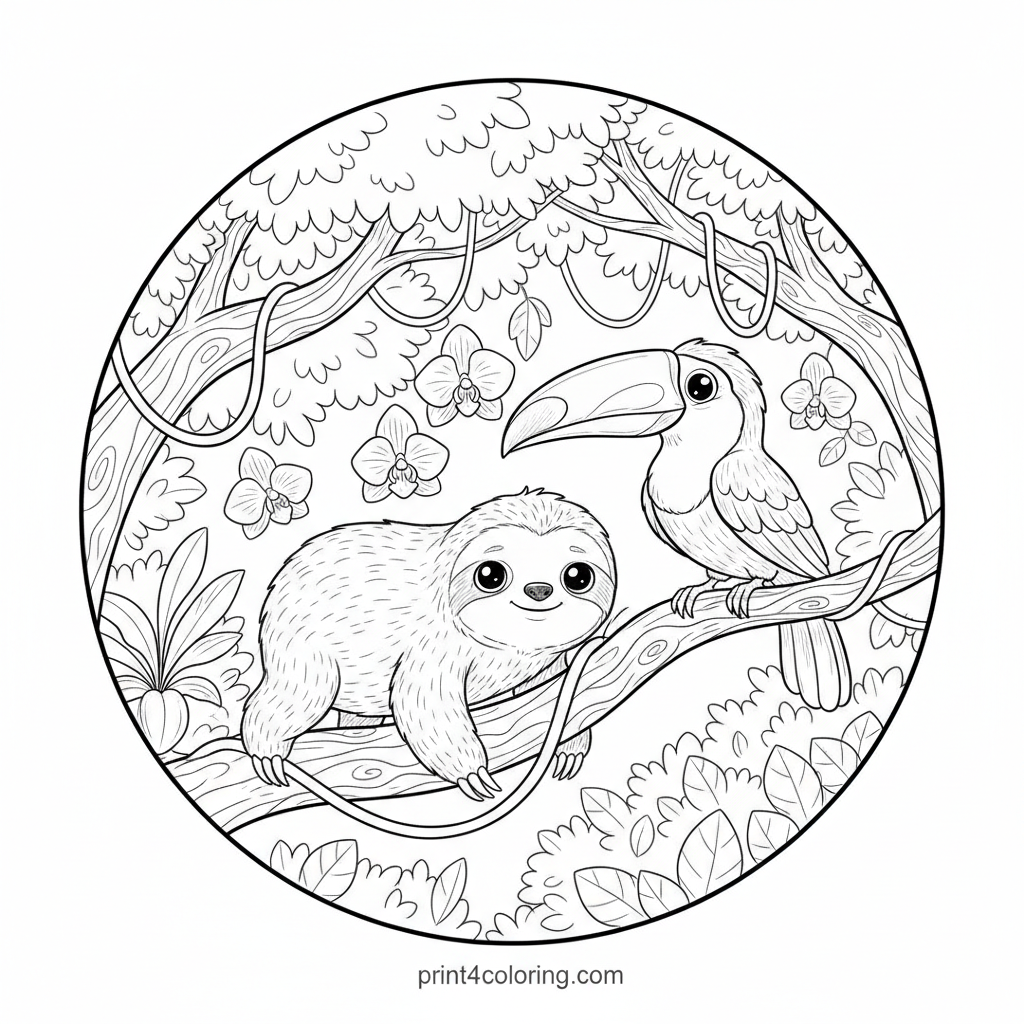 Cozy Canopy Adventure: Sloth & Toucan Rainforest Scene Coloring Page