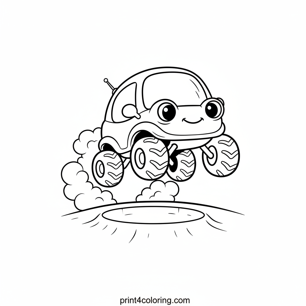 Blast off with our cheerful moon buggy as it takes a gentle, bouncy leap over a small crater on the moon's surface! Puffy dust clouds softly trail behind, creating a cozy scene. This delightful page invites young artists to imagine lunar adventures and add vibrant colors to space!