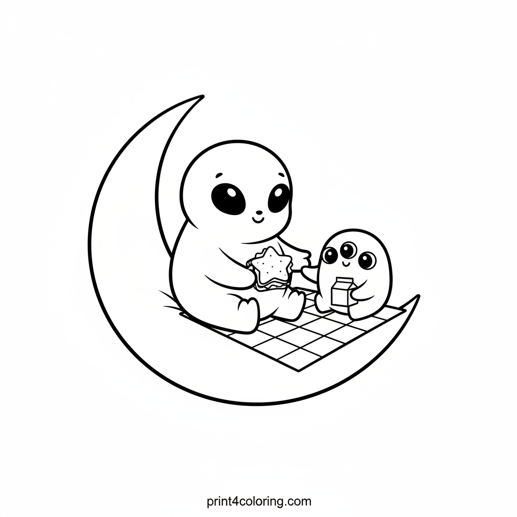 Imagine a friendly alien and its adorable three-eyed pal enjoying a delightful picnic on a crescent moon! They're munching on yummy star-shaped sandwiches and sipping juice under the twinkling cosmos. This cute scene is perfect for little artists to bring to life with their favorite colors, creating a truly out-of-this-world masterpiece.