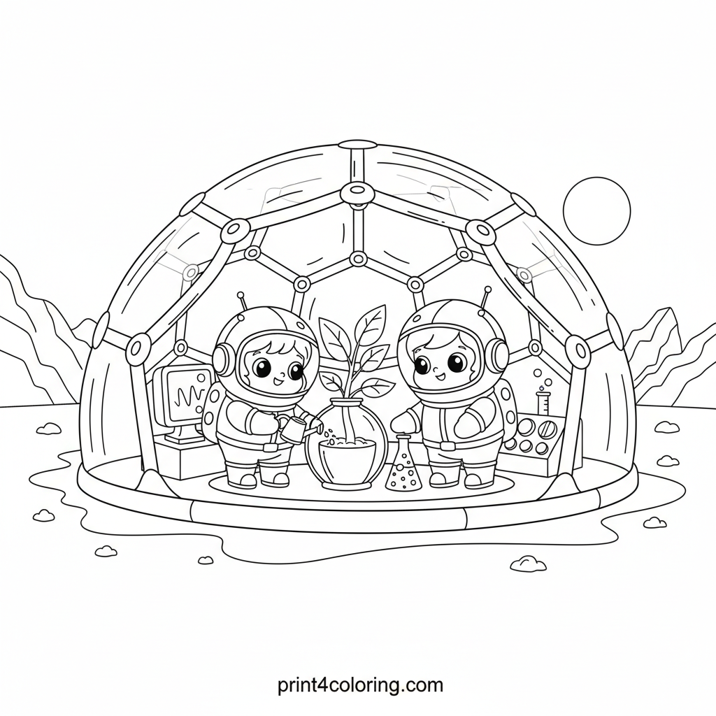 Imagine life on Venus inside this intricate research dome! Friendly scientists are busy observing instruments and tending to a tiny plant experiment within their transparent, geodesic home. Explore the rocky, orange landscape of Venus and bring this peaceful scientific endeavor to life with your colors, discovering wonders beyond Earth.