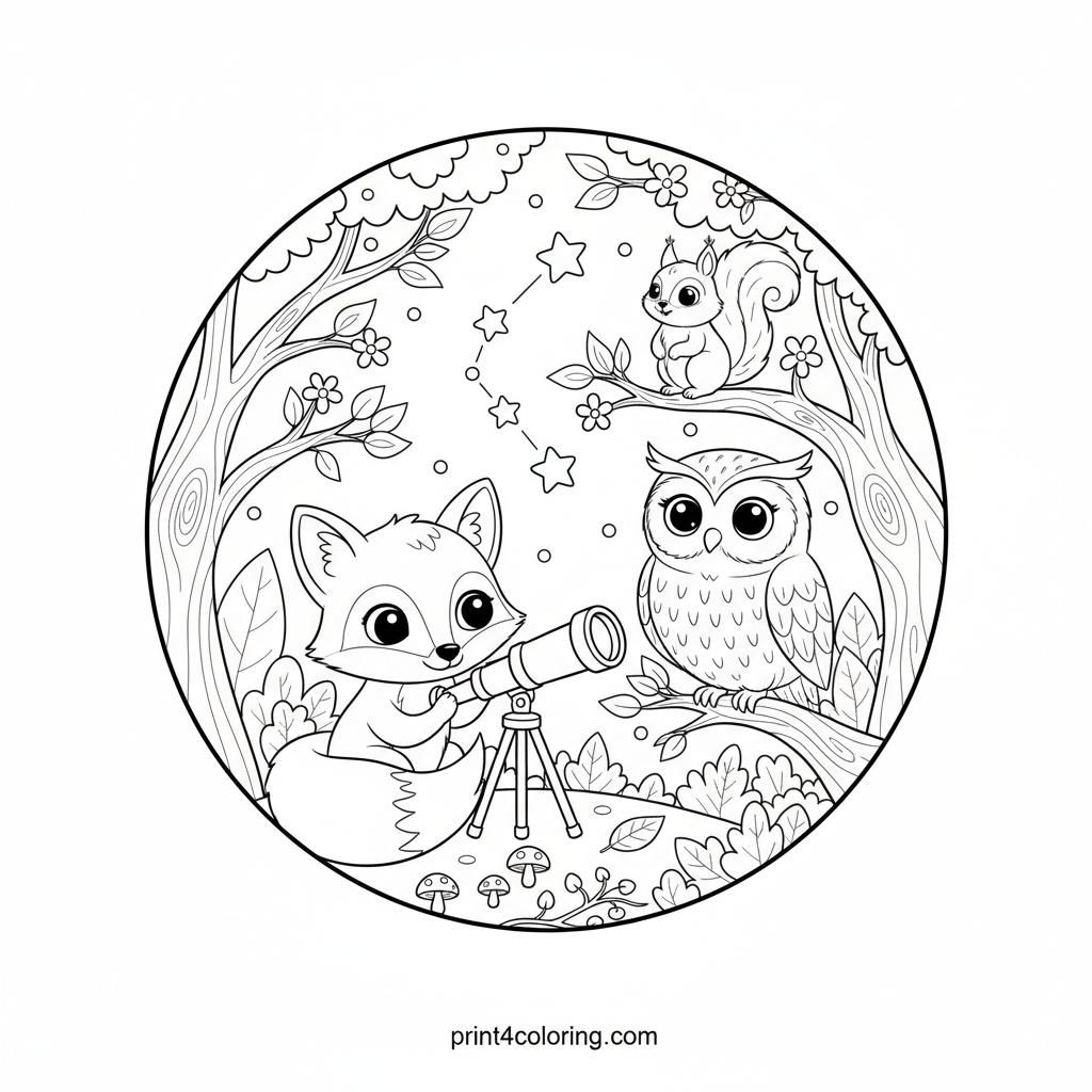 Join a clever fox, a wise owl, and a busy squirrel on a magical night. Gathered in a detailed forest clearing, these friendly critters are captivated by the cosmos through a portable telescope. This enchanting scene invites you to color the twinkling stars, the textured trees, and the curious expressions of our nocturnal friends as they explore the wonders above.