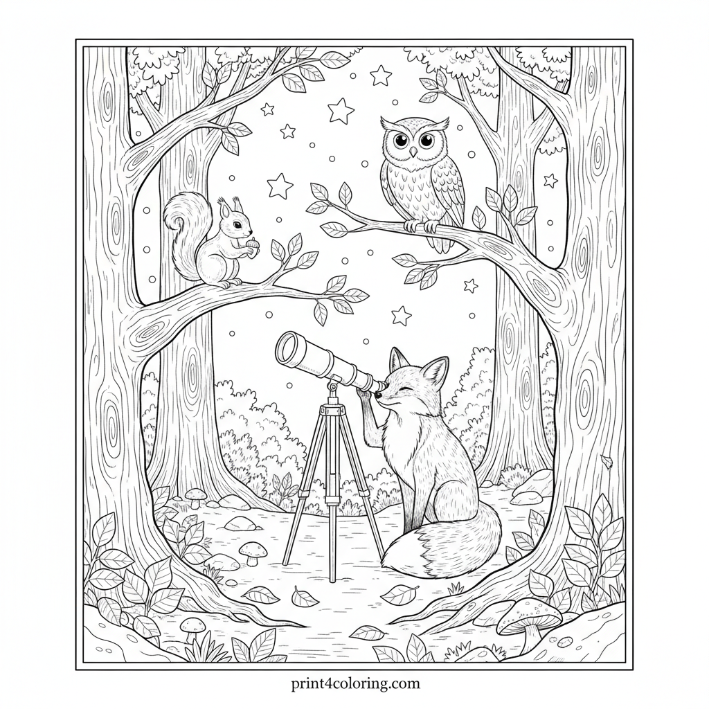 #animals#stargazing#night-sky#forest#nature#telescope#fox#owl#squirrel#adventure#coloring-page#printable