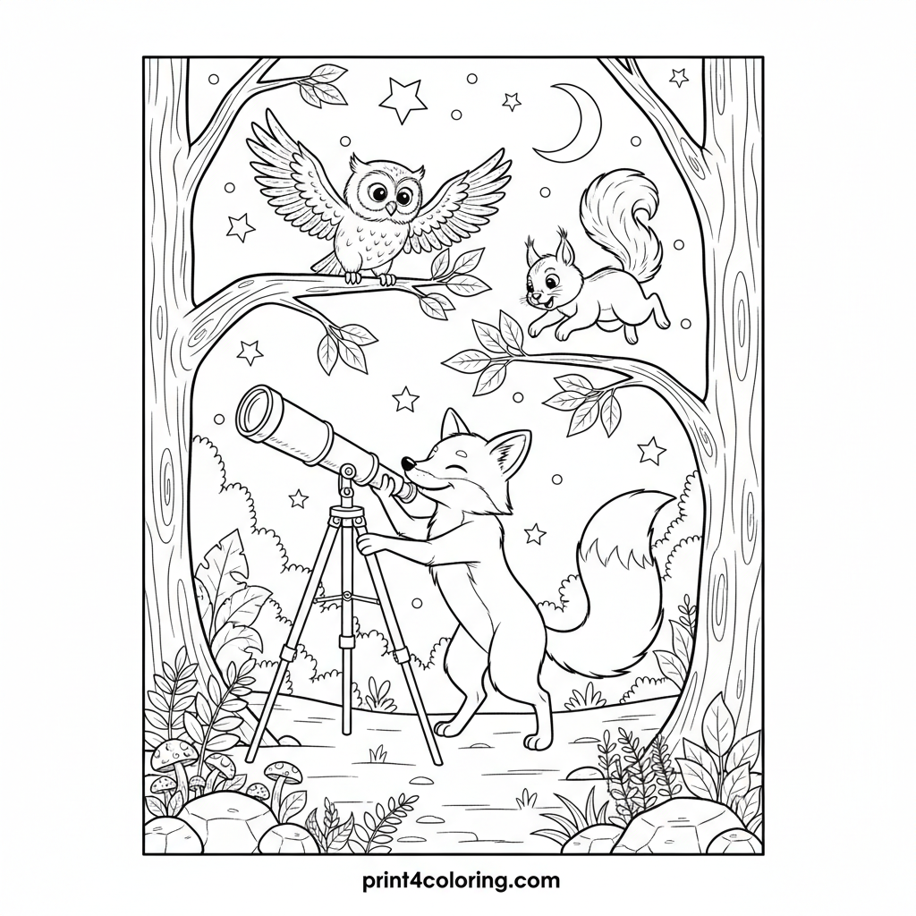 Join a clever fox, a wise owl, and a busy squirrel as they embark on a magical stargazing adventure! This detailed coloring page features forest friends gathered around a telescope, exploring the wonders of the night sky amidst beautifully rendered trees. A perfect scene for young astronomers to bring to life with color.