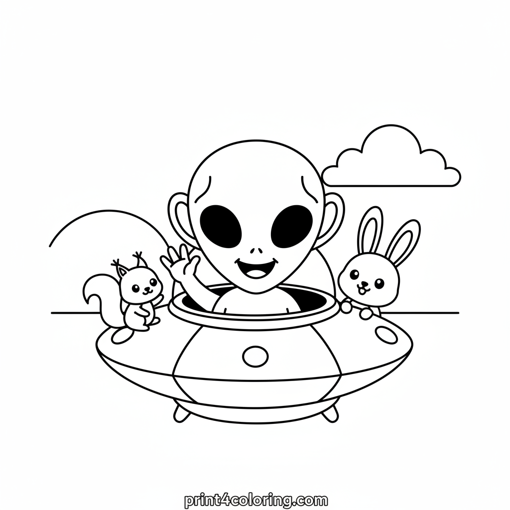 A tiny, friendly alien has landed its small UFO in a sunny park! Peeking from its hatch, our cute space visitor waves hello to a curious squirrel and a cheerful bunny. Get ready to add vibrant colors to this heartwarming intergalactic welcome!