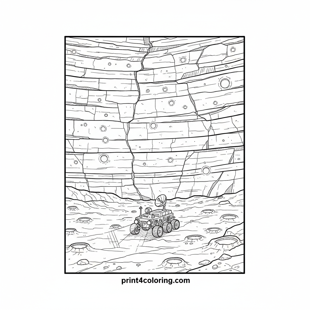 Embark on an epic space adventure with this detailed coloring page! Explore a close-up cross-section of a deep canyon on Planet Mercury, showcasing ancient rock layers and impact craters. A tiny, specialized rover carefully navigates the rugged canyon floor, its lights cutting through the darkness. Imagine the mysteries it might uncover!