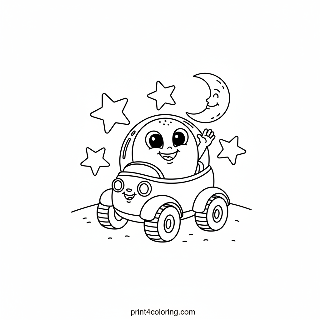 Join a cheerful alien with big, friendly eyes as they wave hello from their super cool, bubbly moon buggy! Explore the starry night sky with a twinkling crescent moon in the background. This fun scene is perfect for little artists to bring to life with bright, imaginative colors. Get ready for an out-of-this-world adventure!